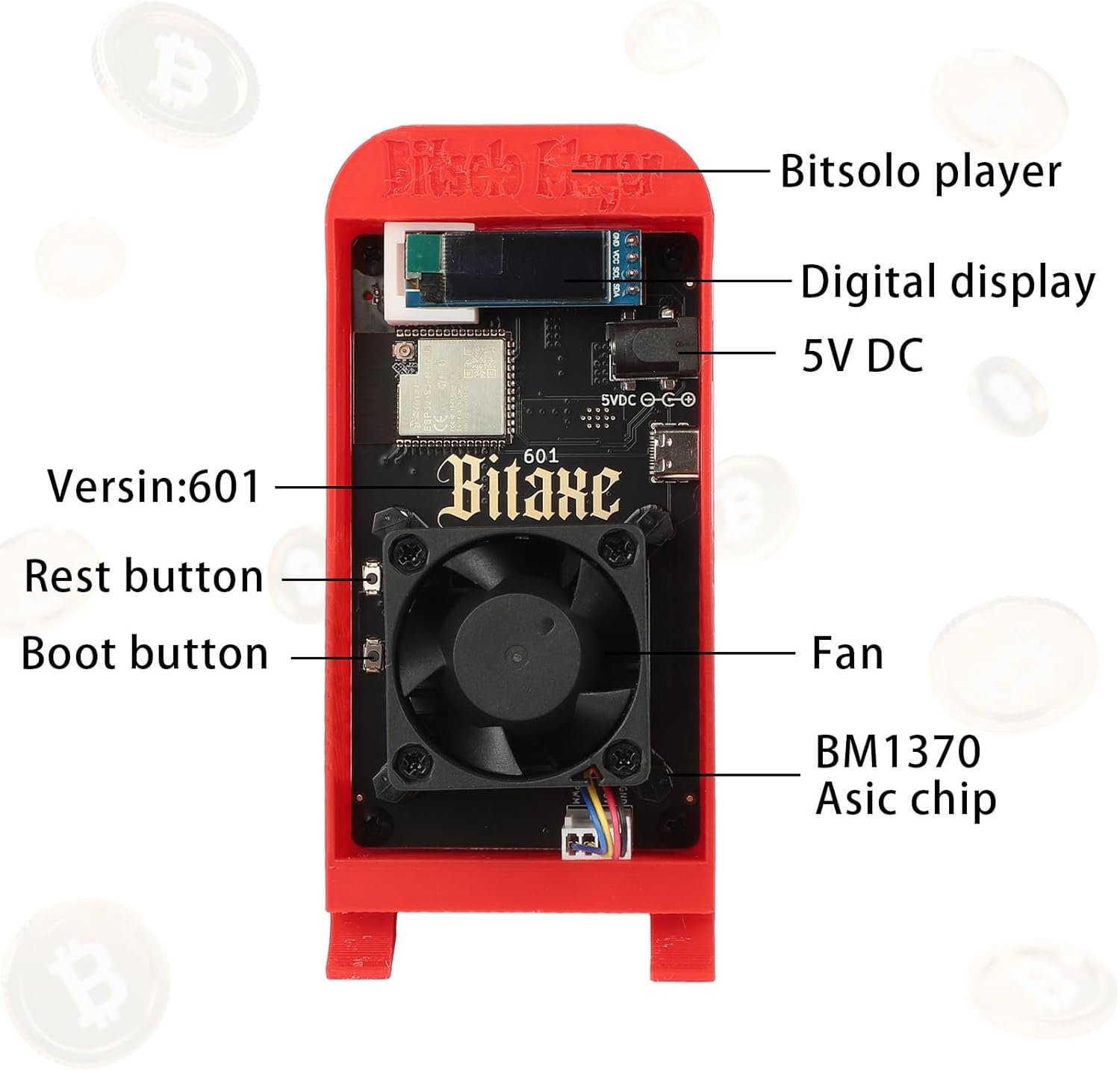 ✔️Hashrate: 1.1TH/s (Terahashes per second) ✔️Power Consumption: 15W –Extremely low energy usage ✔️Efficiency: 14J/TH (Joules per Terahash) –Industry-leading energy efficiency ✔️Type: Open-Source ASIC Miner ✔️Application: Bitcoin Miner, Crypto Miner, Home Miner ✔️Connectivity: Wifi only ✔️Quiet Operation: Optimized for home environments ✔️Compact Design: Minimal space usage, ideal for desktop or small mining setups ✔️Easy to Integrate with Open-Source Mining Software & Pools