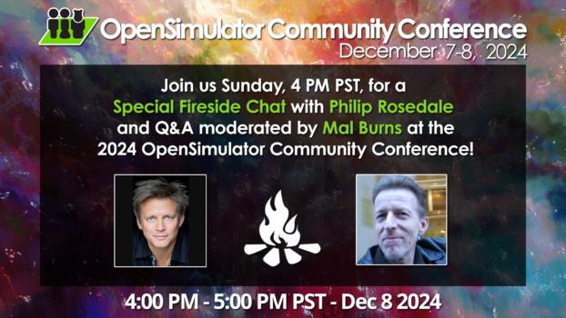 Second Life founder Philip Rosedale is coming to OpenSim tomorrow, Sunday Dec. 8, at 4 p.m. Pacific Time for a fireplace chat on the OpenSimulator Community Conference.